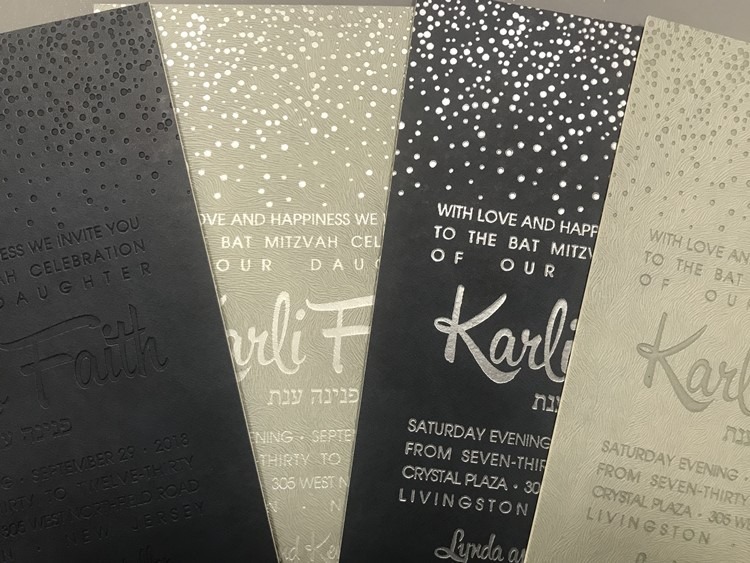Lacivert, gri termo deri kumaş üzerine gömme baskılı davetiye, kalın sıvamalı, uyumlu zarfı ile birlikte. Ebat:15,5*22,5 cm