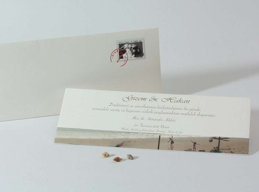 Kalın sıvamalı yatay davetiyeler, uyumlu yatay zarfı ile birlikte varak ve mühür istenirse ilave edilir Ebat: 11×28 cm