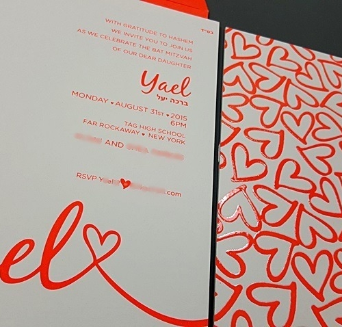 Beyaz mat kağıda neon turuncu baskılı, 3 kat davetiye, Arka taraf kalpler kabartma lak uygun zarfı ile birlikte. Ebat: 14,5×20 cm