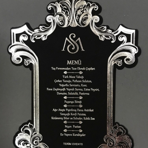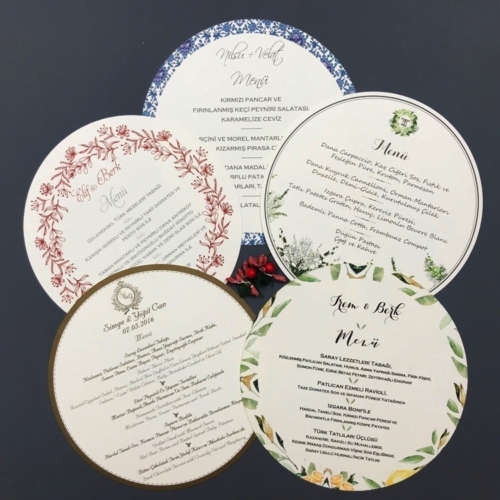 Davetiye konseptinizle aynı tasarımda menü, masa numara kartları,